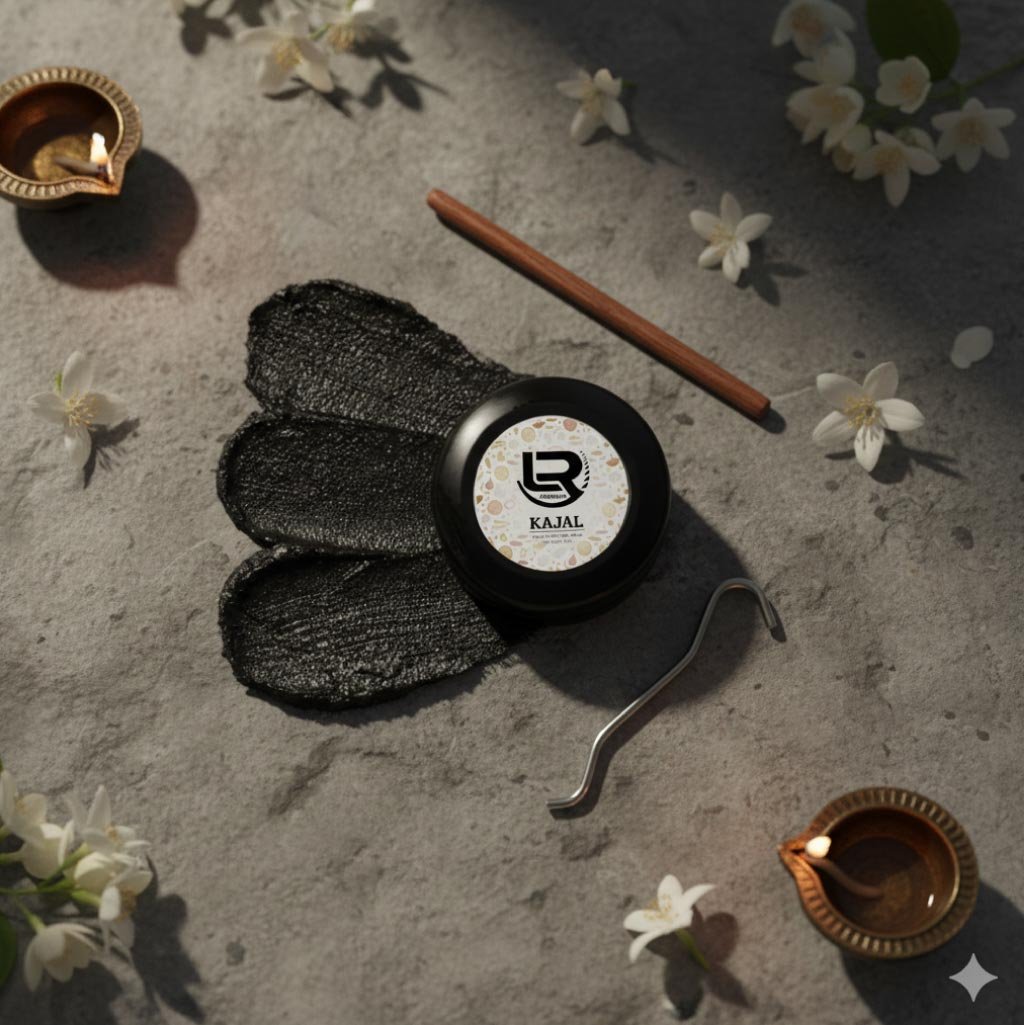 This natural kajal is completely handmade and free from artificial colors or fragrances. It is prepared using pure cow ghee, castor oil, cotton thread, a clay diya, and a copper plate — following a traditional method that has been used for generations. A small cotton wick is soaked in ghee and castor oil, then lit in a clay lamp.